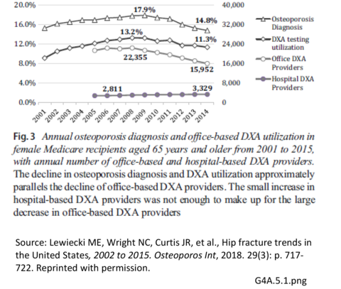 Currently available data are not conducted at the person-level and do not link lifestyle factors or treatment with diagnosis; therefore, causal relationships cannot be established. However, there are many factors that may be associated with the current osteoporosis treatment gap, including (1) a decrease in DXA testing, (2) a decrease in the number of providers performing DXAs, and (3) the decreasing prevalence of women with osteoporosis diagnoses, which may contradict some of the epidemiologic data.